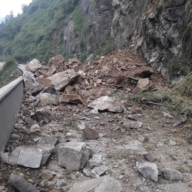 5月10日14點,國道318線天全縣境內(nèi)月亮灣大橋往二郎山方向約60m處公路內(nèi)側(cè)邊坡發(fā)生小規(guī)模崩塌,緊急搶修后交通恢復(fù),但坡體上部仍殘留下較多的崩塌物,有隨時下滑掩埋路面再次阻斷交通的可能,途經(jīng)車輛極其危險,安全隱患極大。