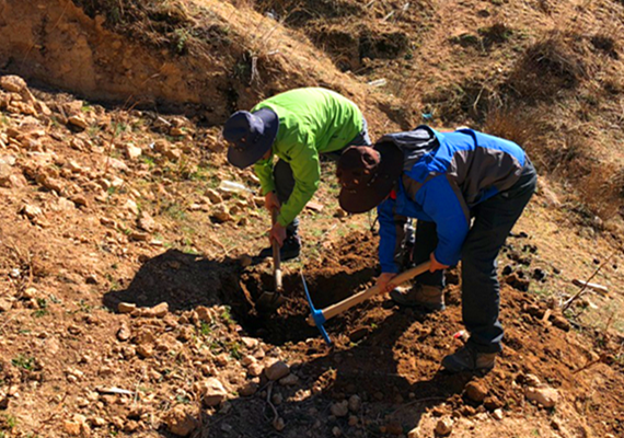 由于卡洛村郎機(jī)嶺溝泥石流勘查設(shè)計(jì)項(xiàng)目地處藏區(qū),語言不通等因素,項(xiàng)目組人員便自行購置鋤頭、鐵鍬等工具,開展槽探和采集樣品工作。頂著高原的烈日,在海拔近4000m的斜坡開展詳細(xì)地質(zhì)調(diào)繪和地形圖測(cè)量工作,方便米飯和涼水便解決了一日三餐,但項(xiàng)目組人員沒一人喊苦叫累。終于,經(jīng)過兩天的辛苦工作,項(xiàng)目組順利完成了郎機(jī)嶺溝泥石流勘查設(shè)計(jì)項(xiàng)目野外工作。