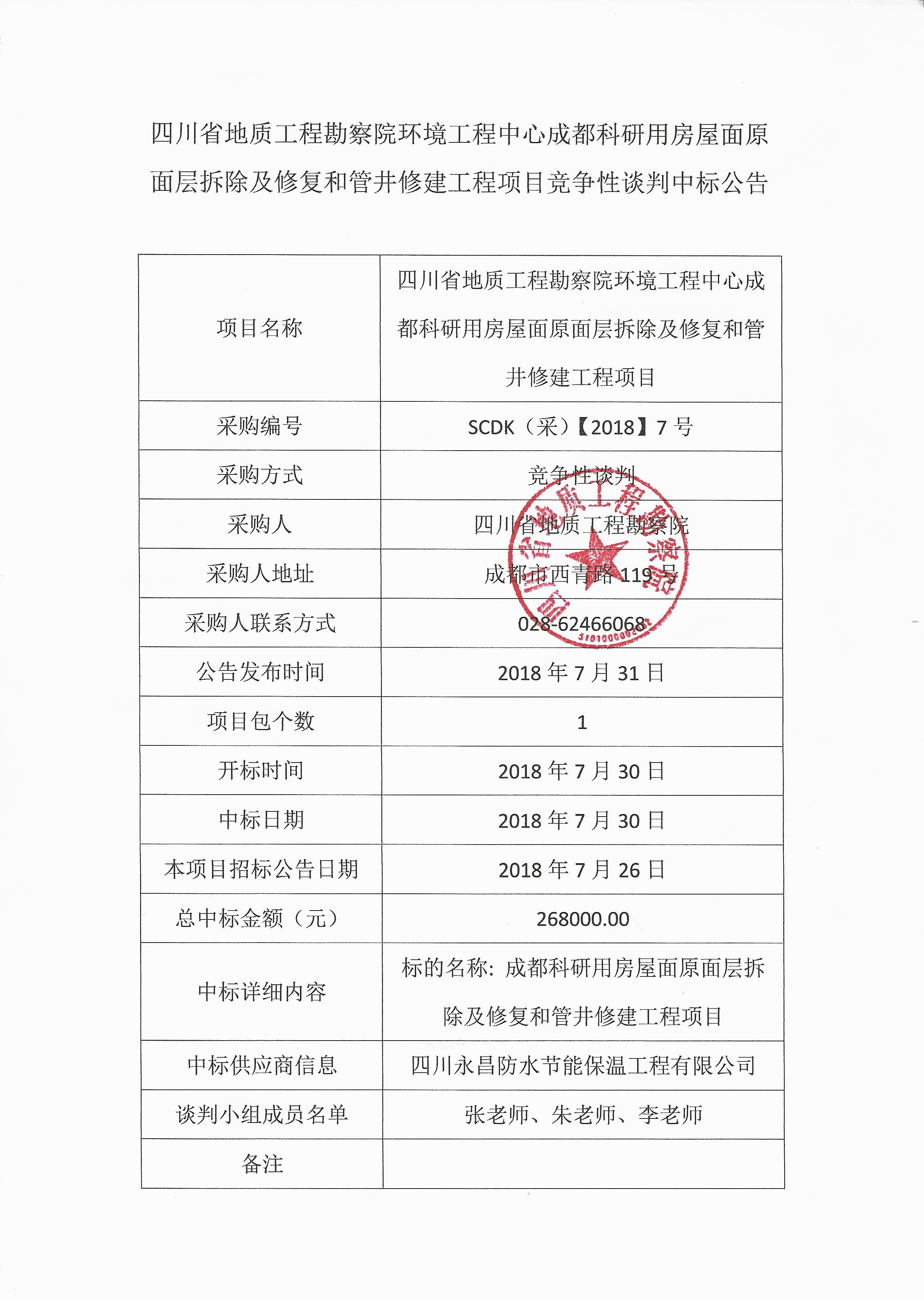 四川省地質(zhì)工程勘察院成都科研用房屋面原面層拆除及恢復(fù)和管井修建工程項目競爭性談判中標(biāo)公告